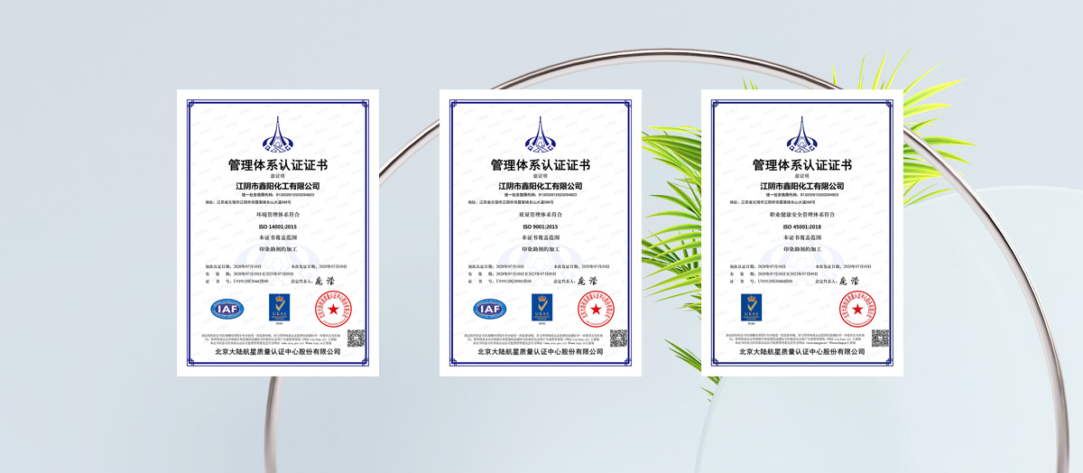 江陰市鑫陽化工有限公司始創于1984年,坐落于經濟發達的江陰市徐霞客鎮工業區,占地面積35畝,廠房面積25000平方米,北臨S38常太高速,西臨G2京滬高速,交通四通八達便利。        鑫陽化工是一家國內知名的紡織印染助劑研發、生產和銷售的專業化公司,擁有年產紡織化學品30000噸的規模,配套設施齊全,DCS、CS系統能夠確保產品品質的穩定,2015年先后獲得ISO-1400環境管理體系、ISO14001質量管理體系和ISO-45001職業健康管理體系的認證,多年來,我們深耕有機硅領域,獲得了一大批忠誠度的客戶,現已發展成為集前處理、染色、印花...